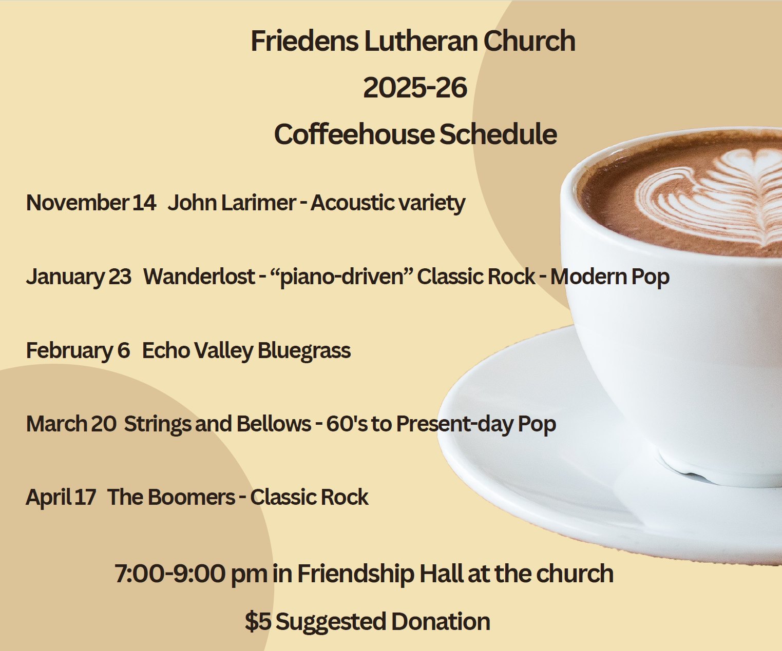 Coffee House Schedule for 2024-2025 Friendship Hall 7-9 PM Refreshments will be provided. Suggested donation